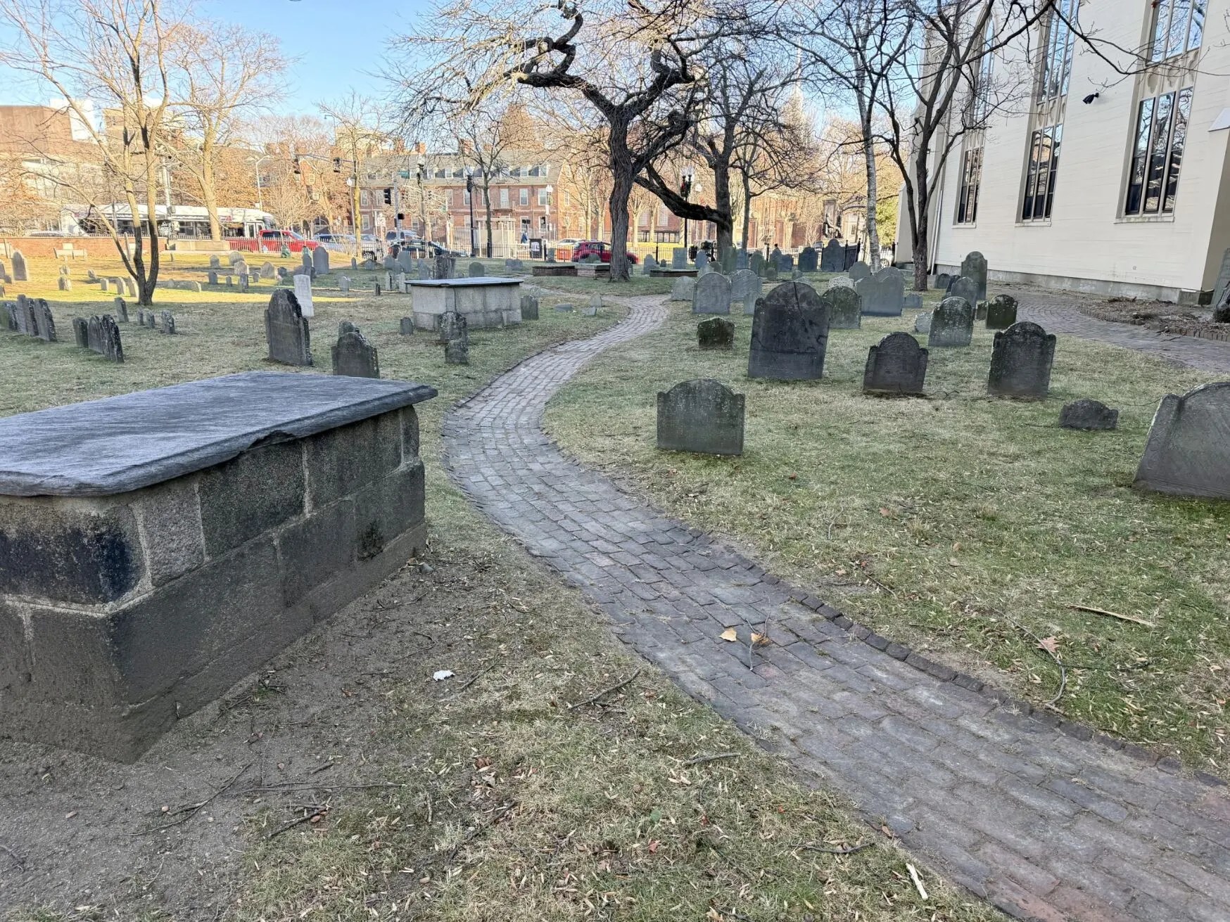 Now that the snow has melted and spring is (tentatively) here, visitors can once again stroll the Old Burying Ground behind First Church, adjacent to Garden Street — on long-buried brick walkways that had been forgotten for decades.