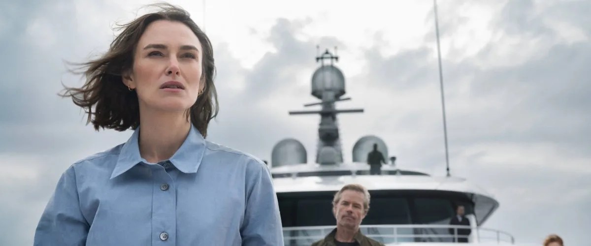 The source for this cockamamie psychological thriller is a 2016 mystery crime novel by Ruth Ware about a Norwegian oil heiress dying of cancer whose vast fortune is driving the boat – literally: The waning Anne Bullmer, her husband, Richard, and a cast of B-level celebs board a luxury yacht set for a slow sail to the Norwegian fjords so Anne can hold a press conference and announce the posthumous destination of her dollars. Ware’s novels are enjoyable hate reads; the modus operandi is always a cheap, manipulative shell game that is at once frustrating and fun to grapple with. Same here in this adaptation by Simon Stone, who showed such promise with the Ralph Fiennes archaeological drama “The Dig” (2021), but the pacing’s off and the implausibility more obvious. The casting is a strong suit, with Guy Pearce as the debonair hubby with much at stake and a statuesque Keira Knightly (“Pride & Prejudice,” “Bend It Like Beckham”) as Laura “Lo” Blacklock, an investigative reporter asked by Anne (Lisa Loven Kongsli) to join the cruise to document Anne’s final days and the announcement. Anne shares with her a document showing that her billions are all earmarked to charity and Richard is written out. (That’s not a spoiler.) To keep us off balance, much is told from Lo’s addled perspective, including what follows: the sounds of a struggle in Cabin 10, a thud and a splash. After a head count of guests and crew on the mini-cruise ship, though, no one seems to be missing and the person-overboard SOS is waived off. Case closed. But no, Lo refuses to stop digging. The more she finds, the less anyone will believe her, and there’s clearly a covert effort afoot to thwart her. Knightly is quite convincing in the delusional/not-delusional part, and the framing of the luxe yacht on the high seas is breathtaking. Too bad the plot had weak sea legs in print and founders more on the screen.
