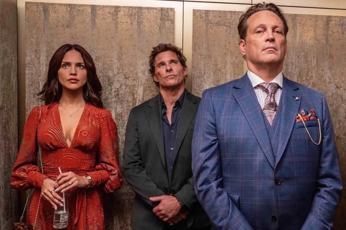 The film’s set in the aftermath of Jimmy’s release. Why Sosa, a Black man, refers to Jimmy, who is not Black, as his son is never fully explained — though both spew the same low brow rhetoric and spend much of their time at strip clubs, ogling and hooting. But then there’s the two Nicks, who happen to be one and the same. Did I mention there’s a time machine? There is, and so Vaughn’s Nick from the future comes back to get the Nick of the present to help save Mike. Adding further complications is that Nick’s estranged wife Alice (a fiery Eliza Gonzalez, who is about the best thing in the movie) is hooking up with Mike.